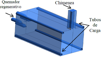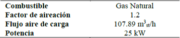 El horno está equipado con un quemador regenerativo que permite reutilizar parte de la energía de los gases de combustión, cuenta con 4 tubos por donde se ingresa aire para simular la carga térmica y una chimenea con puerta ajustable para moderar la salida de gases por este ducto. Las condiciones de operación a las que fue realizada la evaluación energética se muestran en la Tabla 1.