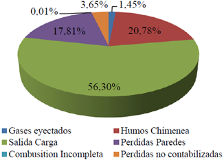 La siguiente fuente de pérdidas son las paredes del horno que configura un 17.8 %; sin embargo, es importante resaltar que estas pueden estar asociadas a una sección del horno donde están ubicados dos accesos ópticos para monitorear el régimen de combustión sin llama, en los cuales no hay aislamiento cerámico, lo que incrementa las pérdidas de energía.
