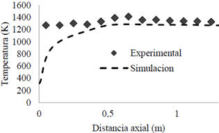 En la figura 5 se muestran los datos experimentales de temperatura sobre la línea central del horno, junto con los datos obtenidos por la simulación.