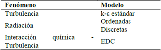 Los modelos para turbulencia, radiación e interacción entre química y turbulencia son listados en la Tabla 2, seleccionados a partir de lo reportado en la literatura [14], [18]-[20].