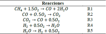 En particular, el modelo Eddy Dissipation Concpet (EDC), usado para modelar la interacción entre la cinética química y turbulencia, fue seleccionado debido a que los modelos convencionales están asociados con procesos de reacción rápidos, lo que no es compatible con la fenomenología del régimen de combustión sin llama, donde la reacción, al darse de forma distribuida, es mucho más lenta, en comparación con la combustión convencional. En la simulación el gas natural fue tomado como CH4, dado que esta especie abarca más del 96 % (en volumen) de la composición química del combustible. Por lo anterior, se utilizó el mecanismo de reacción propuesto por Westbrook y Dryer con las modificaciones en las constantes de reacción que permiten describir adecuadamente la oxidación del combustible en condiciones de combustión sin llama [21], [22]. Las reacciones del mecanismo se muestran en la Tabla 3.