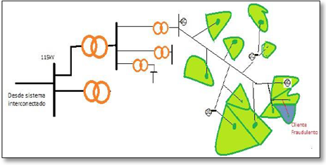 Allí, las zonas verdes corresponden a centros de consumo totalmente medidos en sus fronteras comerciales. La zona azul, por otro lado, muestra un área de clientes fraudulentos detectada en el nodo de inyección de GD en ese ramal. Puesto que los flujos de carga son bidireccionales, se pueden ver islas de consumo igual. Así es como, si existen conexiones fraudulentas comparables a la potencia inyectada de GD, el operador de red puede localizar las zonas en que se encuentran. En caso de uso masivo de GD en el nivel de tensión I (<1kV), aun cuando haya clientes que tengan GD, la demanda de la zona tendría el mismo consumo de energía eléctrica, sin reflejar su disminución en ciertas horas.