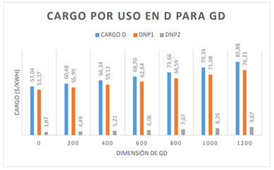 De acuerdo con los resultados del estudio, el aumento promedio del cargo es de 2,25$/kWh. Este manifiesta evidencia en un ligero distanciamiento entre las curvas de cargos durante la penetración de la energía solar fotovoltaica. Asimismo, se presenta una disminución del cargo por disponibilidad para inyección de GD. El orden de magnitud al valor del costo unitario no se aleja significativamente de un escenario sin GD y, en su lugar, alternativas de compensación para remuneración de la red.
