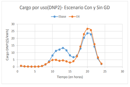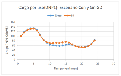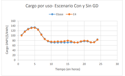El cargo promedio para un escenario base es de 88,13$/kWh. El cargo promedio para un escenario con inyección SFV al circuito radial, 89,15$/kWh. En cualquier caso, estas compensaciones cambian en la medida en que haya mayor consumo en el pico de la noche desde la red. Es notorio que, en momentos los momentos del día en los que no hay sol, los cargos por uso (DNP1) son los mismos, mientras que los cargos de respaldo sí varían dependiendo de la generación solar inyectada y/o picos diarios de demanda.