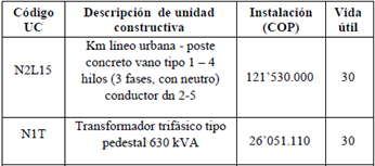 Definición de los costos asociados a cada circuito. Para el caso colombiano, se revisa el costo de la red, de acuerdo a las unidades constructivas según la CREG (Res.097 de 2008), se relacionan en la Tabla 1.