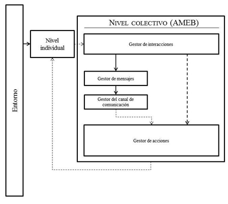 En la figura 2 se presenta la estructura del módulo colectivo de AMEB, que consta de cuatro capas de gestión centrales: el gestor de interacciones; el de acciones, que posibilita la coordinación emergente; el de mensajes y el de canales de comunicación. Cada individuo representa un microsistema, y las interacciones a nivel particular permiten la aparición de fenómenos a nivel global, que al ser observables pueden considerarse como la aparición de la emergencia en el sistema.