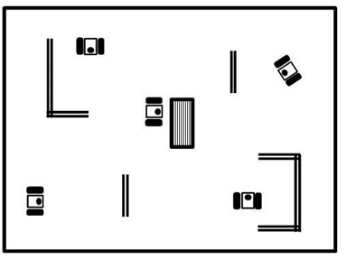 Se asume un entorno con 5 robots, un objeto y obstáculos representados por marcas en el suelo (Ver figura 3).