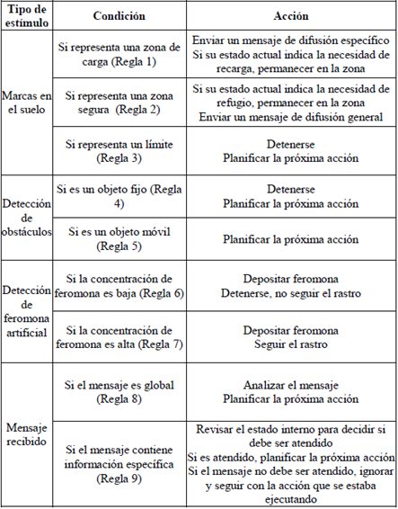 Las reglas de la tabla 1 están construidas de acuerdo con las capacidades de los robots objeto de estudio y el ambiente de prueba. Estas mismas reglas podrían generalizarse, basados en ambos aspectos.
