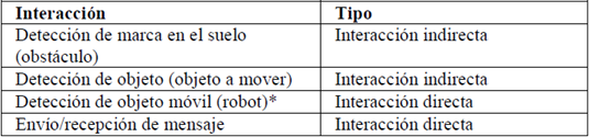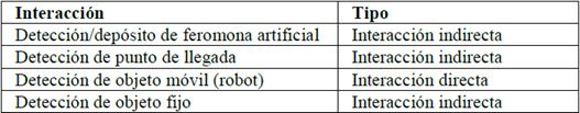 Indirectas: A través de marcas artificiales en el ambiente. Estas marcas pueden ser producto de sensores virtuales, como feromonas artificiales, o pueden encontrarse en el entorno, como huellas en el suelo. Las marcas generan interacción entre los robots cuando son detectadas por más de uno.