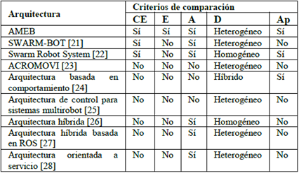 En ese trabajo, se consideran los problemas de autoconfiguración y autooptimización. La configuración del sistema se lleva a cabo mediante descripciones semánticas, lo que permite el emparejamiento semántico de los robots para dar respuesta a las solicitudes de ensamblaje. Esto hace posible seleccionar las mejores configuraciones, minimizando así los costos totales de ensamblaje y los tiempos en que el sistema está fuera de línea. En [7], se propone una solución para la utilización de sistemas multirobots en la resolución del problema del viajero. Puesto que este problema es del tipo NP-Hard, las soluciones tradicionales no son adecuadas para aplicaciones robóticas. En este trabajo, se propone una solución basada en mover-mejorar, en donde un robot se mueve e intenta mejorar su solución mediante la coordinación con sus vecinos. Este proceso se realiza en cuatro etapas: asignación de objetivos, construcción de tours, negociación de objetivos conflictivos y mejora de las soluciones. En [8], se presenta una técnica de navegación distribuida para enjambres de robots móviles, donde cada individuo posee un controlador basado en comportamientos básicos, mediante la implementación de un autómata híbrido. La composición paralela de los autómatas individuales permite la coordinación de los individuos para generar un comportamiento de bandada en el grupo.