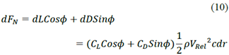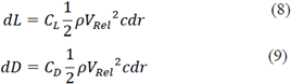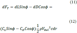Las fuerzas de sustentación y arrastre pueden descomponerse en una fuerza normal dFN al plano de rotación, que contribuye con el empuje, y una fuerza tangencial dFT al círculo barrido por el rotor, que es la fuerza que genera el torque disponible en la turbina [8]. Ambas fuerzas vienen expresadas por las Ecuaciones (10) y (11), respectivamente.