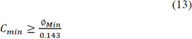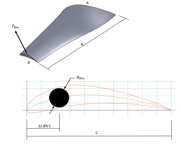 Se asume que la sección transversal del álabe es circular, con el fin de determinar un diámetro mínimo ∅Min de sección para soportar las cargas. Dicha sección circular debe estar contenida en el espesor máximo del álabe. De acuerdo con la Tabla 1, el espesor máximo del perfil Eppler 420 es 14,3 % de C y se presenta al 22,8% de C. Por lo tanto, la longitud de la cuerda mínima (Cmin ) en la raíz del álabe puede deterinarse usando la Ecuación (13).