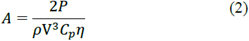 El área que la turbina hidrocinética tiene que barrer con el fin de obtener la potencia deseada se define a partir de la Ecuación (2) [8]-[9].
