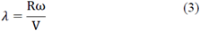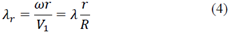 donde ω es la velocidad rotacional del rodete (rad/s). En cada sección del álabe es posible determinar la relación de velocidad local en la punta λr, que se define por la Ecuación (4).