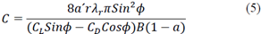 Adicionalmente, se produce una fuerza de arrastre dD en la dirección del flujo. La fuerza de arrastre es causada por las fuerzas de fricción viscosa en la superficie del perfil del álabe y la diferencia de presión a la que están sometidas las caras inferior y superior del álabe, debido al flujo de agua que las atraviesa. Las fuerzas dL y dD pueden encontrarse a partir de la definición de los coeficientes de sustentación CL y arrastre CD, como se expresa en las Ecuaciones (8) y (9), respectivamente.