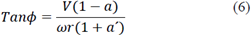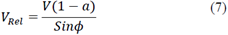 También de la Figura 4, la velocidad relativa del agua puede expresarse como función de la velocidad del agua, la fracción de inducción axial y el ángulo de la velocidad relativa, tal como indica la Ecuación (7).