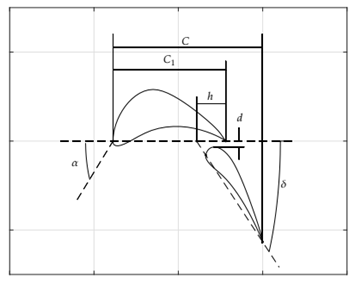 Inicialmente, para el diseño del perfil multielemento (Figura 2) se siguieron las recomendaciones de estudios previos [11]. La longitud del segundo elemento es el 30% de la longitud de la cuerda del perfil principal C1. El espacio vertical (d) entre el perfil principal y la solapa posterior se varió entre 2 y 3 % de longitud de la cuerda del perfil principal C1. El espacio horizontal (h) entre el borde de salida del álabe principal y el borde anterior del segundo elemento (o solapa) se mantuvo fijo en un 5% de la longitud del perfil principal C1. El ángulo de deflexión entre el perfil principal y la solapa (δ) se varió entre 20 y 50°. Asimismo, el ángulo de ataque (α) se varió durante las simulaciones en el código JavaFoil.