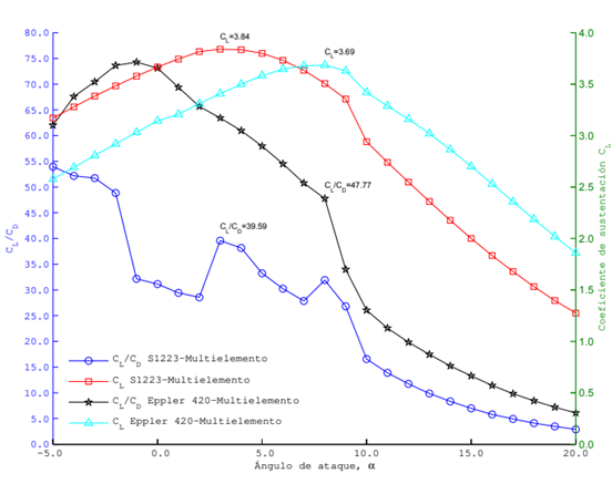 En general, la sustentación de los perfiles analizados aumenta con el ángulo de ataque. Sin embargo, este aumento no es infinito: llega un punto en el que la pendiente de la curva empieza a disminuir, lo que implica que el perfil pierde capacidad de sustentar. Este fenómeno es conocido como entrada en pérdida del perfil, y está asociado al desprendimiento de la capa límite del fluido. En el caso específico del perfil Eppler 420 multielemento, el ángulo de ataque donde se presenta la mayor relación entre el coeficiente de sustentación y arrastre es de 8°. Si se compara con el ángulo de ataque óptimo de 17° para el perfil Eppler 420 tradicional, el ángulo de ataque óptimo del perfil multielemento es mucho menor, como ocurre con todos los perfiles multielemento estudiados en comparación con el perfil tradicional.