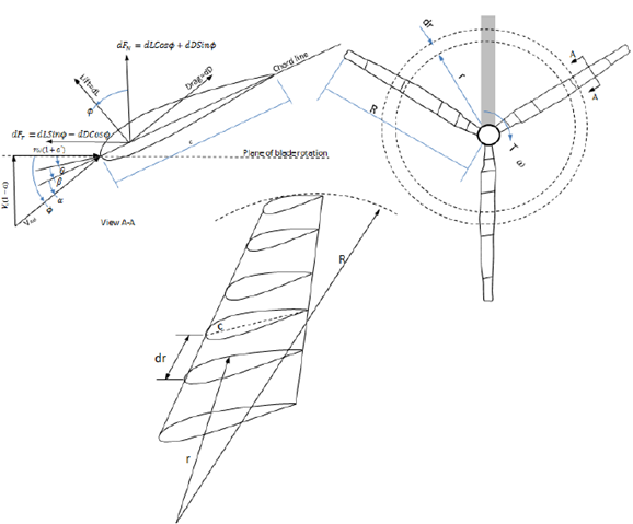 Por otra parte, la teoría BEM es útil para obtener expresiones del torque desarrollado y la fuerza de empuje que experimenta la turbina. Esta teoría se basa en el análisis de la fuerza hidrodinámica que se aplica al elemento radial del álabe de longitud infinitesimal. En la Figura 4, se muestra un corte transversal del elemento del álabe. También se muestra la fuerza aerodinámica actuando en el elemento de álabe [20]. El flujo de agua establece un diferencial de presión alrededor del elemento del álabe, lo cual resulta en una fuerza perpendicular a la dirección del movimiento del agua. Esta fuerza se denomina: fuerza de sustentación dL.