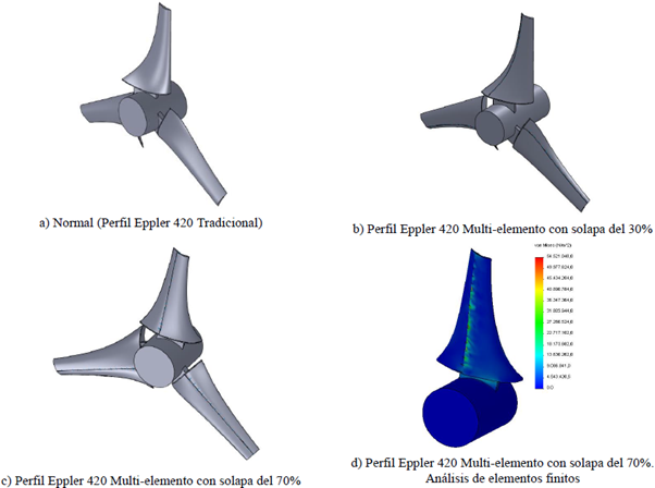 Con el objetivo de determinar la distribución de esfuerzo sobre el álabe, el modelo final se sometió a un análisis de elementos finitos e intereacción fluido-estructura [23] en el software Ansys. Los resultados (Figura 6d)) muestran que el esfuerzo de von Mises es menor que el esfuerzo de fluencia del material, que será usado para la fabricación del álabe (Nylon). Los mayores esfuerzos se presentan en los refuerzos de conexión entre el perfil principal y la solapa posterior y en la raíz del álabe.