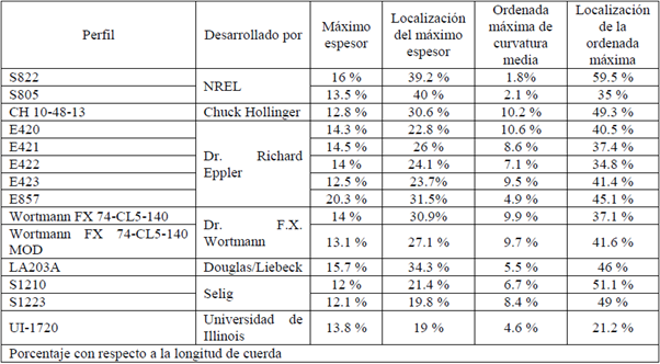 En la tabla 1 se presentan las principales características de cada uno de los perfiles aerodinámicos a ser evaluados.