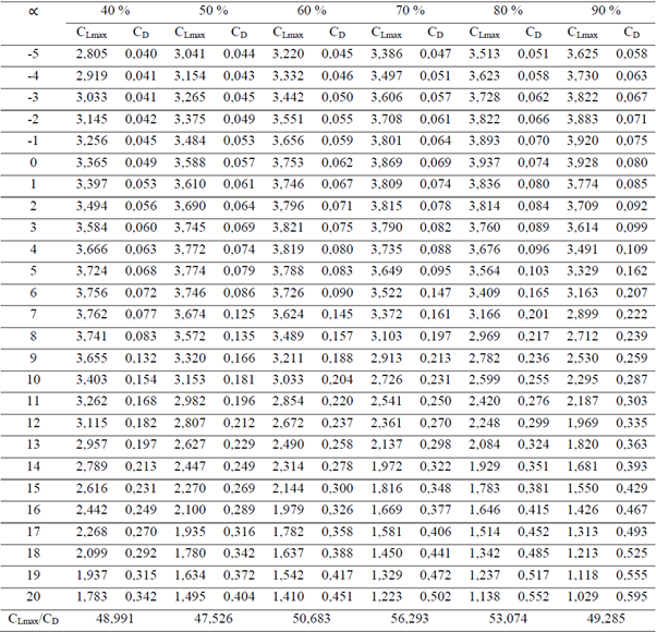 Los resultados del análisis sobre cómo cambian los coeficientes de sustentación (CLmax) y arrastre (CD) y su relación CLmax/CD del perfil multielemento Eppler 420 cuando se varía el porcentaje de la cuerda del flap con respecto a la longitud de la cuerda del perfil principal se muestran en la Tabla 2.