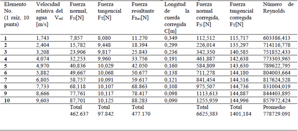 Las dimensiones iniciales de la cuerda podrían dificultar la construcción de los álabes y generar altos niveles de esfuerzo en la raíz de los álabes. Usando las ecuaciones (11) y (12) es posible determinar las fuerzas normal y tangencial a las que se encuentran sometido el álabe. La fuerzas normales y tangenciales para cada sección del álabe se muestran en la Tabla 4.