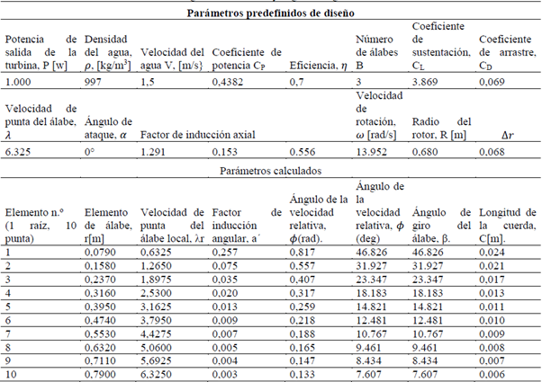 En la Tabla 3, pueden observarse los parámetros predefinidos para el diseño de los álabes; es decir, la potencia de diseño, las condiciones de la corriente de agua, el coeficiente de potencia, la eficiencia mecánica, el número de álabes, la velocidad de punta del álabe, el ángulo de ataque, los coeficientes de sustentación y arrastre, el factor de inducción axial, la velocidad rotacional y el radio del rotor.