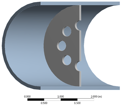 La geometría se definió para medio recipiente que contiene la mitad del interno, haciendo uso de la simetría, sin considerar los cabezales y las boquillas, como se detallan en la Figura 1, con la finalidad de ahorrar costo computacional. La Figura 2 muestra el modelo geométrico generado mediante la herramienta de diseño Autocad v2017, el cual se prepara en formato *.sat para su uso posterior en el análisis de esfuerzos. El análisis se realiza en la mitad del recipiente, y el interno se ubica centrado en el mismo. Las boquillas y cabezales no se consideran puesto que el equipo se analiza similar a una tubería.