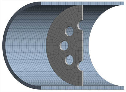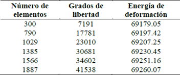 Se realizan pruebas de independencia de malla para garantizar la convergencia de la solución al rango asintótico de la variable solución del problema de elementos finitos. La Figura 4 muestra el mallado del recipiente con interno utilizando elementos hexagonales cuadráticos. En la Tabla 1 se muestran los valores obtenidos para la malla seleccionada de 1887 elementos y 41.538 grados de libertad. Adicionalmente, se verificó que el índice de skewness estuviera por debajo del límite admisible de 0,95.