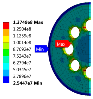 La mayor intensidad del esfuerzo está localizada hacia el interior, en los orificios centrales, para lo cual se recomienda realizar un tratamiento térmico para suavizar tensiones o aplicar un refuerzo (reinforcing pad) alrededor del mismo.