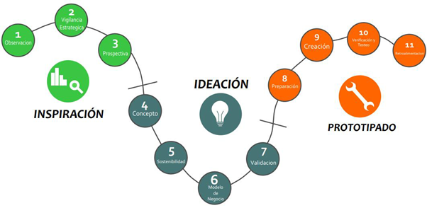Esta adaptación conserva las fases propuestas por la metodología original, desarrolladas en 11 actividades que deben ser llevadas a cabo en equipo; si no se obtienen los resultados esperados en alguna de las etapas, se regresa a la anterior convirtiéndose en un proceso iterativo hasta obtener resultados satisfactorios; de esta forma se garantiza que el proceso de materialización de las ideas innovadoras finalice con un prototipo funcional que pueda ser validado por el usuario final.
