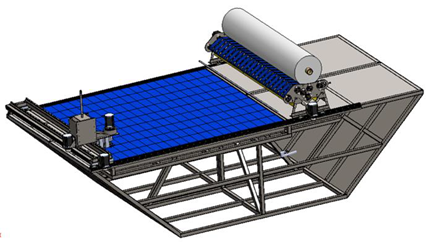 El módulo de extendido es la parte de la máquina que extiende la tela sobre la superficie de corte, se compone de bandas de desenrollado que se encargan de sostener y desenrollar la tela. Este sistema es de alimentación positiva, por lo que el rollo se mueve por la acción de una banda sobre la superficie exterior del rollo, lo que permite controlar mejor la tensión y la velocidad tangencial de la tela. El concepto funcional para el desplazamiento de la tela durante el extendido es innovador, pues es menos complejo que los sistemas comerciales.