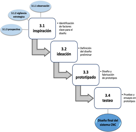 Siguiendo el proceso de design thinking o pensamiento de diseño, fue posible obtener el diseño final de un sistema automático para extendido y corte de tela. Para el análisis del estado actual de la actividad de corte en las empresas de confección, se tomó como caso de estudio la empresa Indecon S. A. S., ubicada en el departamento de Riosucio, Caldas. El proceso de desarrollo tecnológico se llevó a cabo en cuatro etapas (ver figura 2):
