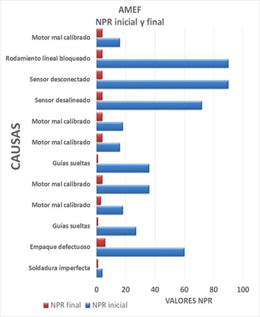 En la figura 4 se muestra la evaluación inicial y final de NPR para doce modos de falla identificados en los componentes de mesa de vacío, mediante el análisis de modo y efecto de falla (AMEF), análisis que permitió refinar el diseño, con base en los posibles fallos detectados.