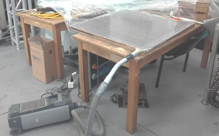 La fabricación del prototipo para el módulo de vacío se realiza en dos fases: la primera, prototipo virtual para hacer justes al diseño elaborado en CAD mientras se van determinando las variables de caudal, potencia y velocidad de vacío (ver figura 5). La segunda, prototipo físico utilizando materiales disponibles en el medio, como son: Aspiradora Lux (Electrolux) D-333 1000W 38 l/seg 31 Kpa, diámetro de succión 38 mm, mesa para vacío de 0,9 x 0,9 m, con separación de 0,015 m, lámina de polietileno de 0,6 mm, licra poliéster, celda de carga 0-5 kg con visualizador digital, cuchilla 4" de longitud, cepillo con cerdas plásticas 95 x 190 x 40 mm.