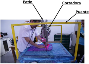 El módulo de corte integrado por el cabezote cortador que se desplaza sobre la mesa de vacío se encarga de posicionar la cortadora en los puntos adecuados listados en el archivo de corte. Se utilizó un equipo comercial con una cuchilla de 4 pulgadas de longitud, que se encuentra instalada sobre el cabezote cortador.