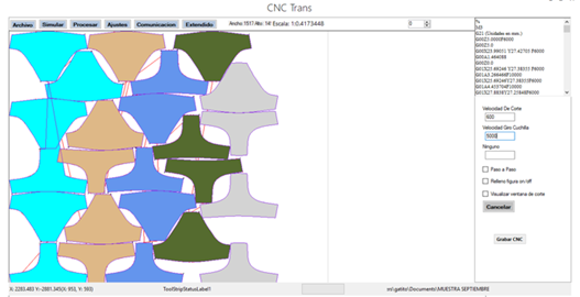 El módulo de control que permite la gobernanza de la máquina, el software de control, opera bajo los parámetros y condiciones de cualquier sistema CNC estandarizado bajo la norma NIST RS274-NGC V3, para sistemas de código abierto. Se procede de acuerdo con los flujos convencionales para planeación y ejecución de corte de telas en la industria de la confección, como sigue: