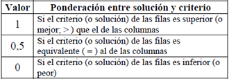 Luego de determinar las soluciones posibles y los criterios de evaluación, se realiza la valoración de cada una de las soluciones, como se muestra en la tabla 1 asignando un peso de acuerdo con la efectividad de la solución.