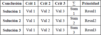 Posterior a esto se realiza la suma de los valores de cada criterio, se adiciona una unidad para evitar que queden valores nulos, luego se calculan los valores ponderados para cada uno. Finalmente se obtiene una tabla de resultados o conclusiones (ver tabla 2), donde se define cuál es la mejor alternativa de solución.