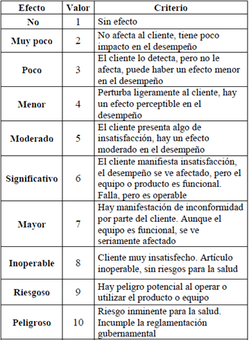 El AMEF se utiliza para identificar los posibles fallos de diseño, manufactura y ensamble que puedan afectar el proceso de producción. En primer lugar, se identifican los componentes del diseño a evaluar, luego se plantea la posible falla, se describen los efectos potenciales y se evalúa de acuerdo con la severidad del fallo (ver Tabla 3).