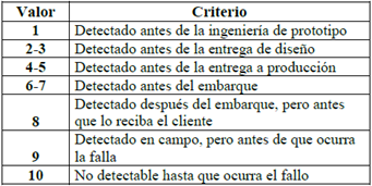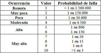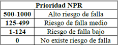 Segundo: se describe la posible causa del fallo y se evalúa la ocurrencia; cada una de estas oscila entre un rango de probabilidad de falla (ver tabla 4). Tercero: se describen los controles preventivos y los controles de detección actuales (ver tabla 5). Cuarto: se calcula el número de prioridad de riesgo (NPR) para definir medidas para el manejo adecuado de los riesgos (ver tabla 6).