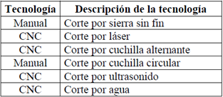Para la clasificación y evaluación de técnicas y tecnologías actualmente usadas para el corte de tela, se aplicó el método ordinal corregido de criterios ponderados. Primero, se realizó una clasificación de tecnologías encontradas en la actividad de vigilancia estratégica por tipo de tecnología (ver tabla 7).