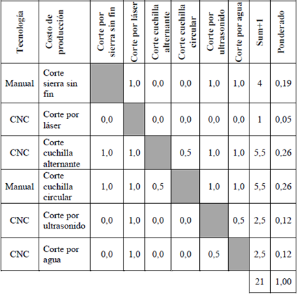 Con el uso del método ordinal de criterios ponderados se evaluó, para el sistema de corte, cada alternativa de solución con el peso específico obtenido por cada criterio, para obtener la tabla comparativa de criterios evaluados, la cual permitió concluir e identificar las alternativas con mayor peso (ver tabla 8).