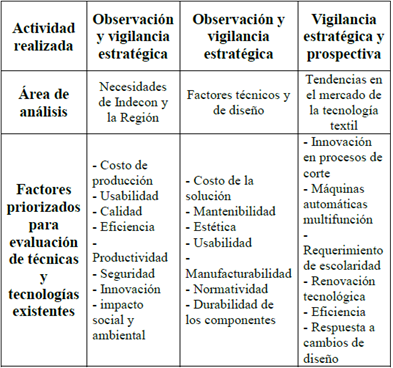 Durante las actividades de observación, vigilancia estratégica y prospectiva, se identificaron y priorizaron factores relacionados con las necesidades de la empresa y de la región, los conceptos de tipo técnico y de diseño relevantes en el uso de tecnologías para corte de tela y las tendencias en el mercado de la tecnología textil (ver tabla 9).