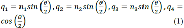 The rotational movements of the human eye can be represented mathematically by means of rotation operators called quaternions. Eyeball rotation an angle θ around the unit vector n = (n1, n2, n3), see figure 2, can be encoded in the quaternion q = q1i + q2j + q3k + q4, where i, j and k are the quaternion units that follow the multiplication rules i2 = j2 = k2 = ijk = -1. The values of the constants qi are shown in Equation 1.