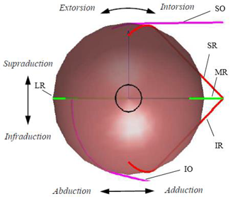 The movement of the human eye occurs due to the combination of three pairs of extraocular muscles. The superior rectus (SR) and the inferior rectus (IR) move the eyeball upwards and downwards, this is, supraduction and infraduction, respectively; the lateral rectus (LR) and the medial rectus (MR) move the eye outwards and inwards, this is, abduction and adduction, respectively; the superior oblique (SO) and the inferior oblique (IO) rotate the eyeball torsionally, intorsion and extorsion. In figure 1, these muscles and their associated movements can be seen for a right eye, and in table 1, the principal action of each extraocular muscle is listed as well as the secondary actions in which it is involved. The measurements of the coordinates of the origin and insertion points can be found elsewhere in the literature [15].