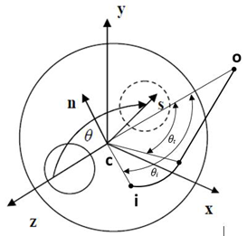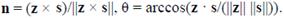 Referring to figure 2, z is the direction of the primary position, usually assumed when the eye is looking straight ahead; s is the unit vector representing the gaze direction at a secondary position; n is the unit rotation vector, perpendicular to z and s, which lies on Listing's plane; the pupil moves along a great arc, centered at the center point c of the eyeball, an angle θ.
