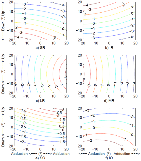 Figure 4 shows level plots of equal deformation, i.e. isodeformation curves, of the six extraocular muscles of a right eye, in a range of horizontal and vertical rotation of +/- 20°. The plots were obtained using the command contour in MATLAB®. These curves clearly show the agonist-antagonist role of each pair of muscles. It is noted that the superior and inferior recti have a share on adduction whether the eye is looking up or downwards, and that the superior and inferior obliques are contracted during infraduction and supraduction, respectively.