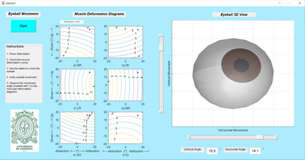 A computer application with a didactic interface was developed in MATLAB. It allows for visualization of eye movements, deformation curves, and the specific deformation state of the extraocular muscles associated with a desired orientation of the eyeball. This interface is proposed as a didactic tool for medical and clinical training.